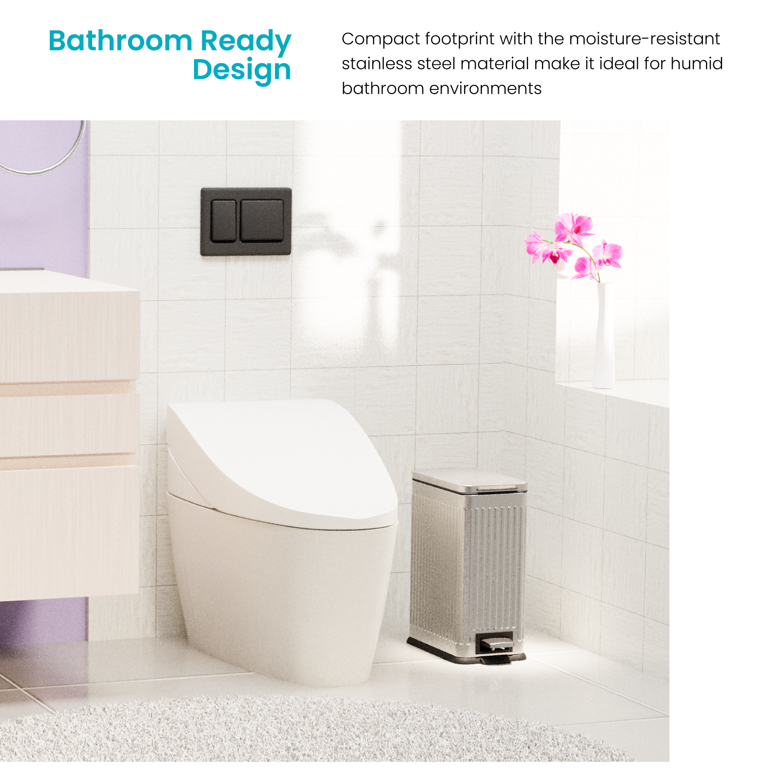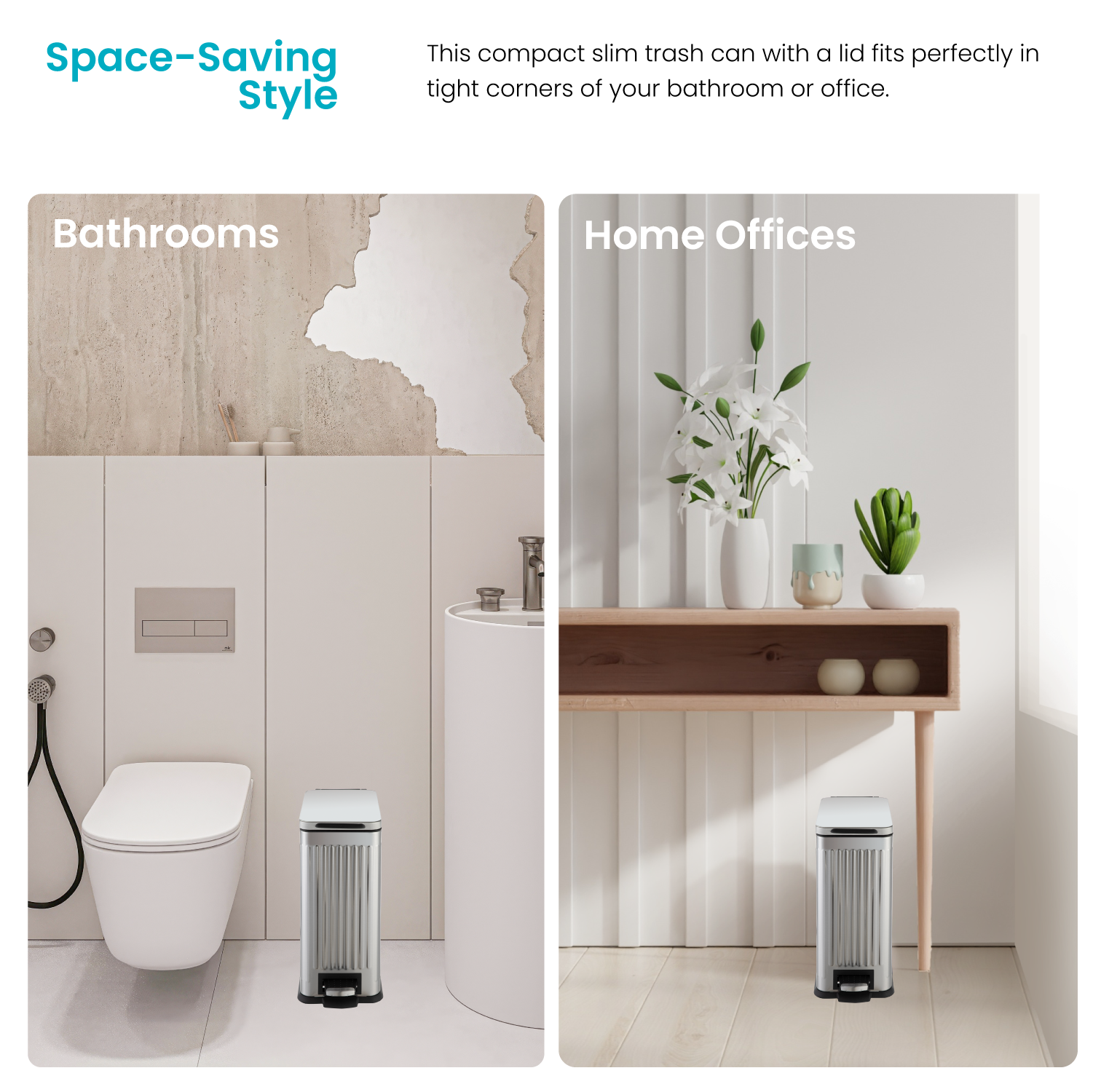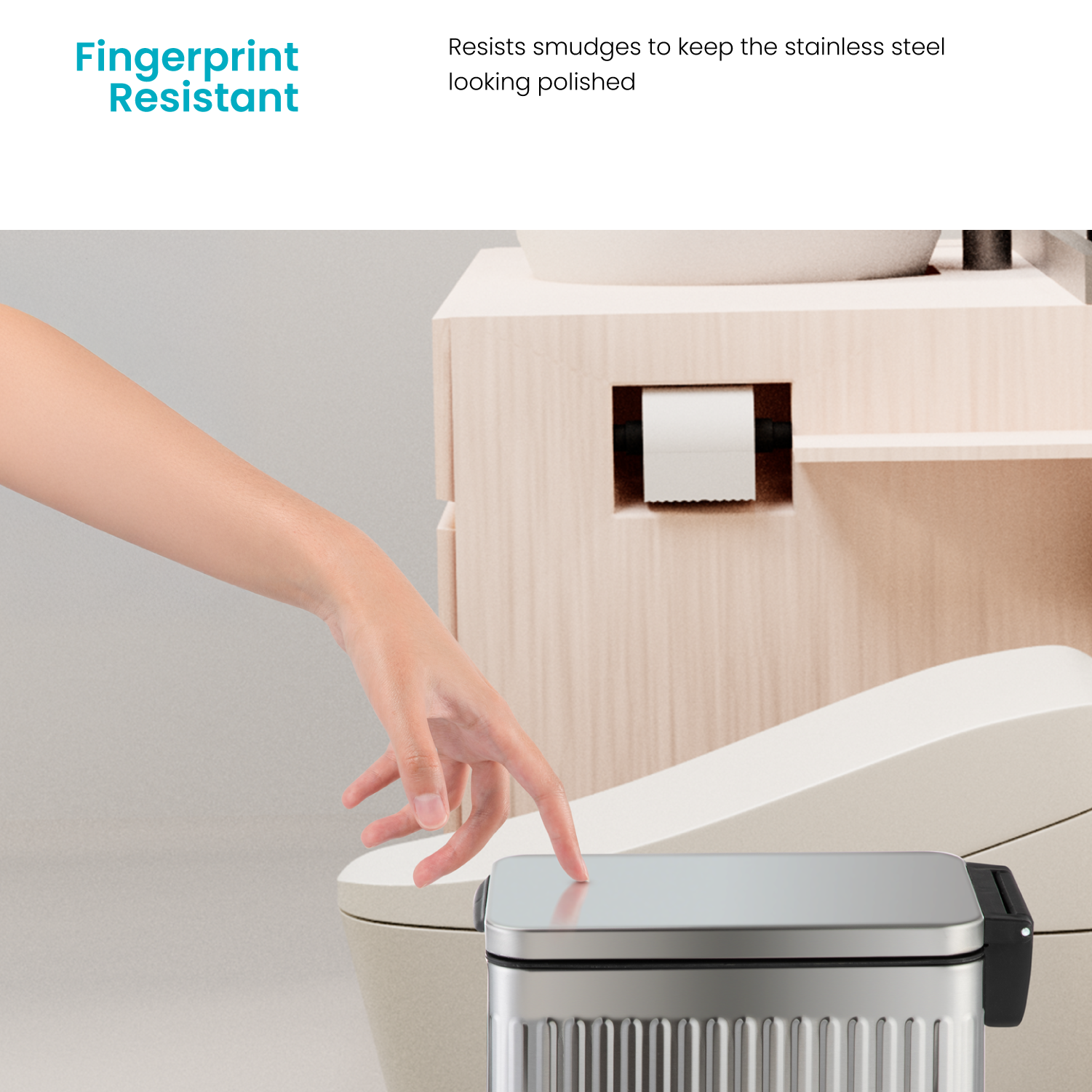 Compact Style Meets Everyday Function. Designed to fit neatly in bathrooms, offices, or other tight spaces, this slim rectangular trash can helps maximize every inch of your room. A removable inner liner makes bag changes quick and cleaning simple, while the soft-close lid prevents noisy slams for a calm, quiet environment. The durable foot pedal provides hygienic, hands-free use when your hands are full, and the fingerprint-resistant stainless steel finish keeps it looking polished day after day.