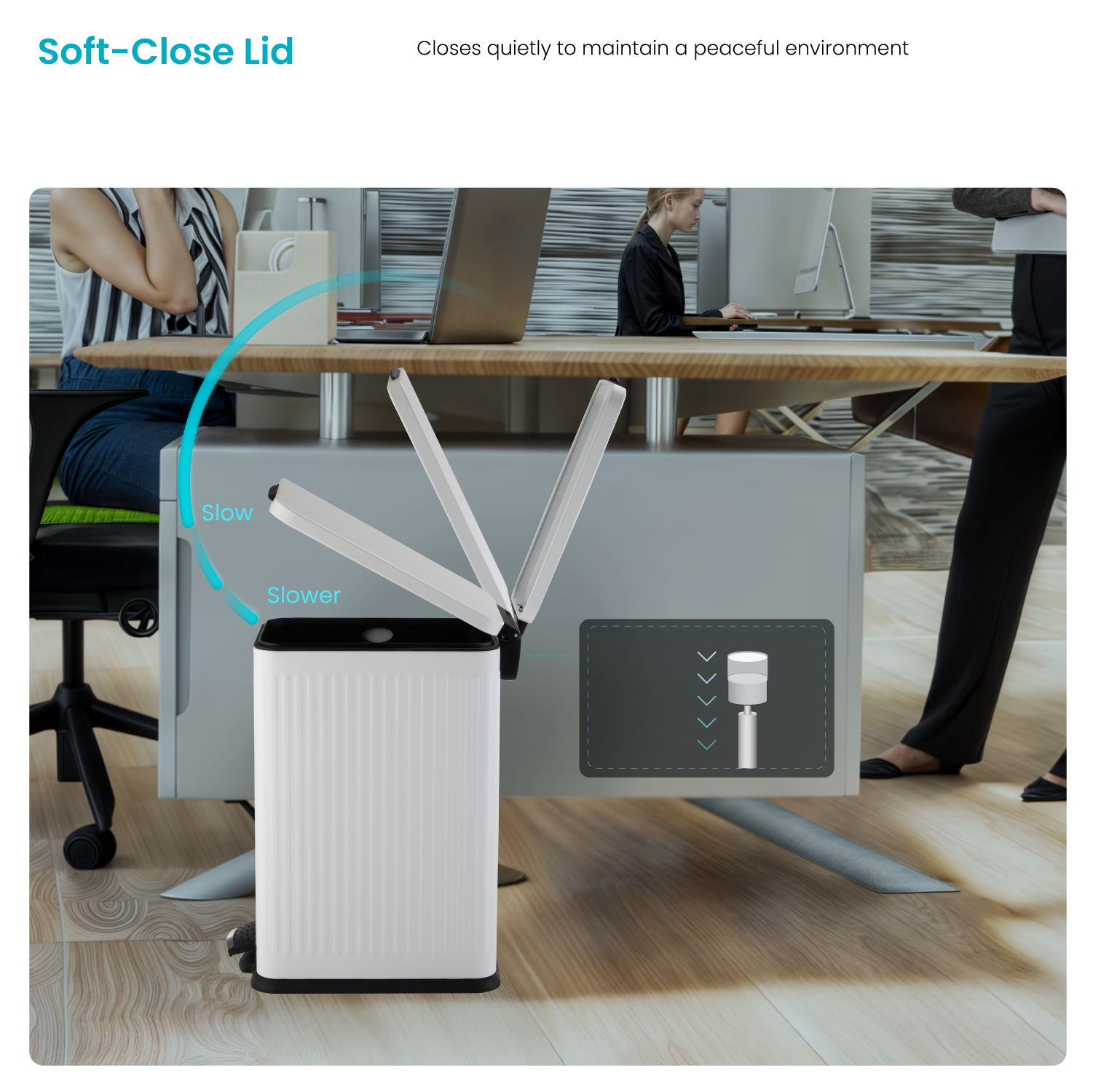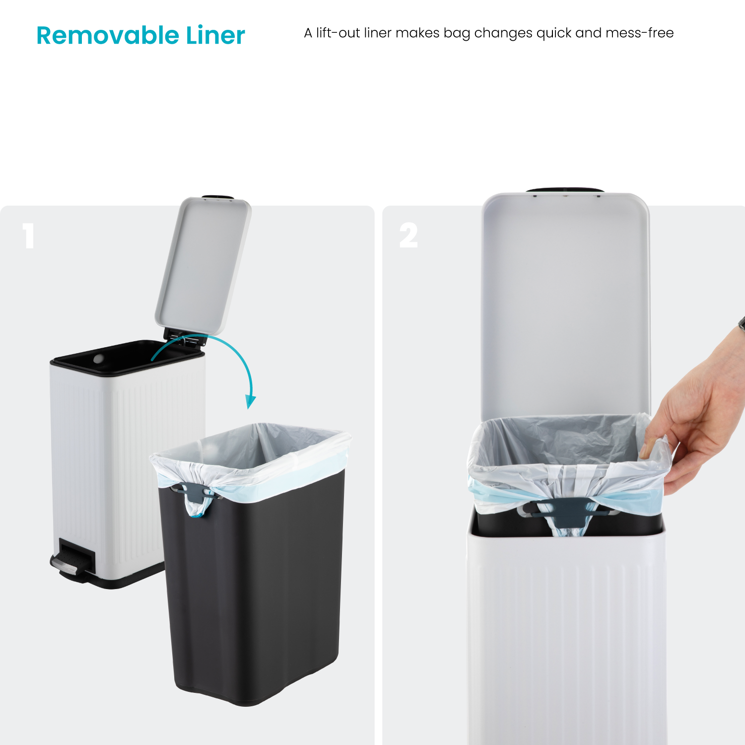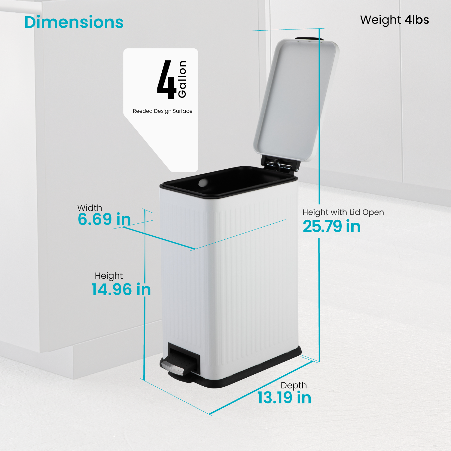 Slim Style for Everyday Spaces. Perfect for kitchens, bathrooms, and offices, this tall and narrow trash can fits neatly under counters, beside cabinets, or tucked into corners. A removable inner bucket with a built-in bag band makes swaps quick and mess-free, while the durable foot pedal offers hygienic, hands-free use when your hands are full. The soft-close lid shuts quietly to maintain a calm atmosphere, and the fingerprint-resistant stainless steel finish keeps the exterior looking clean and polished.