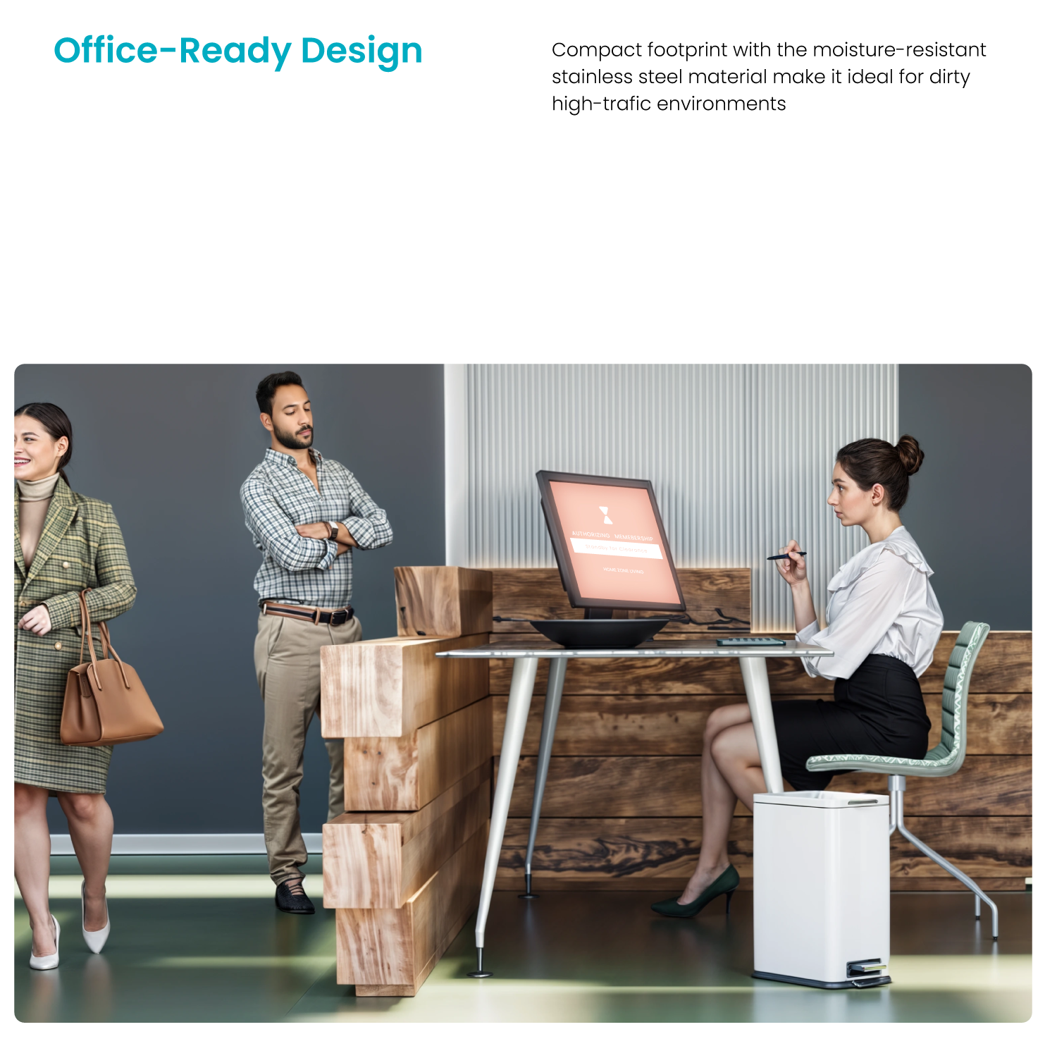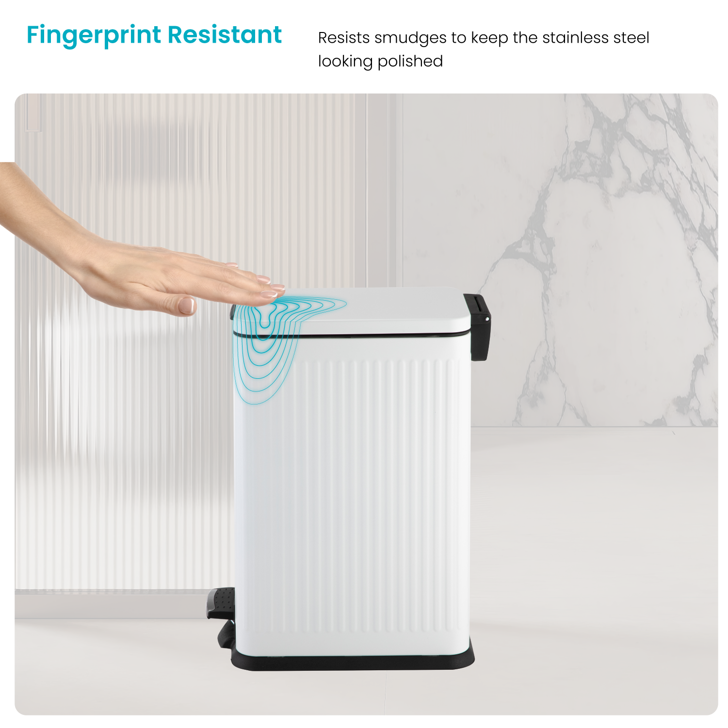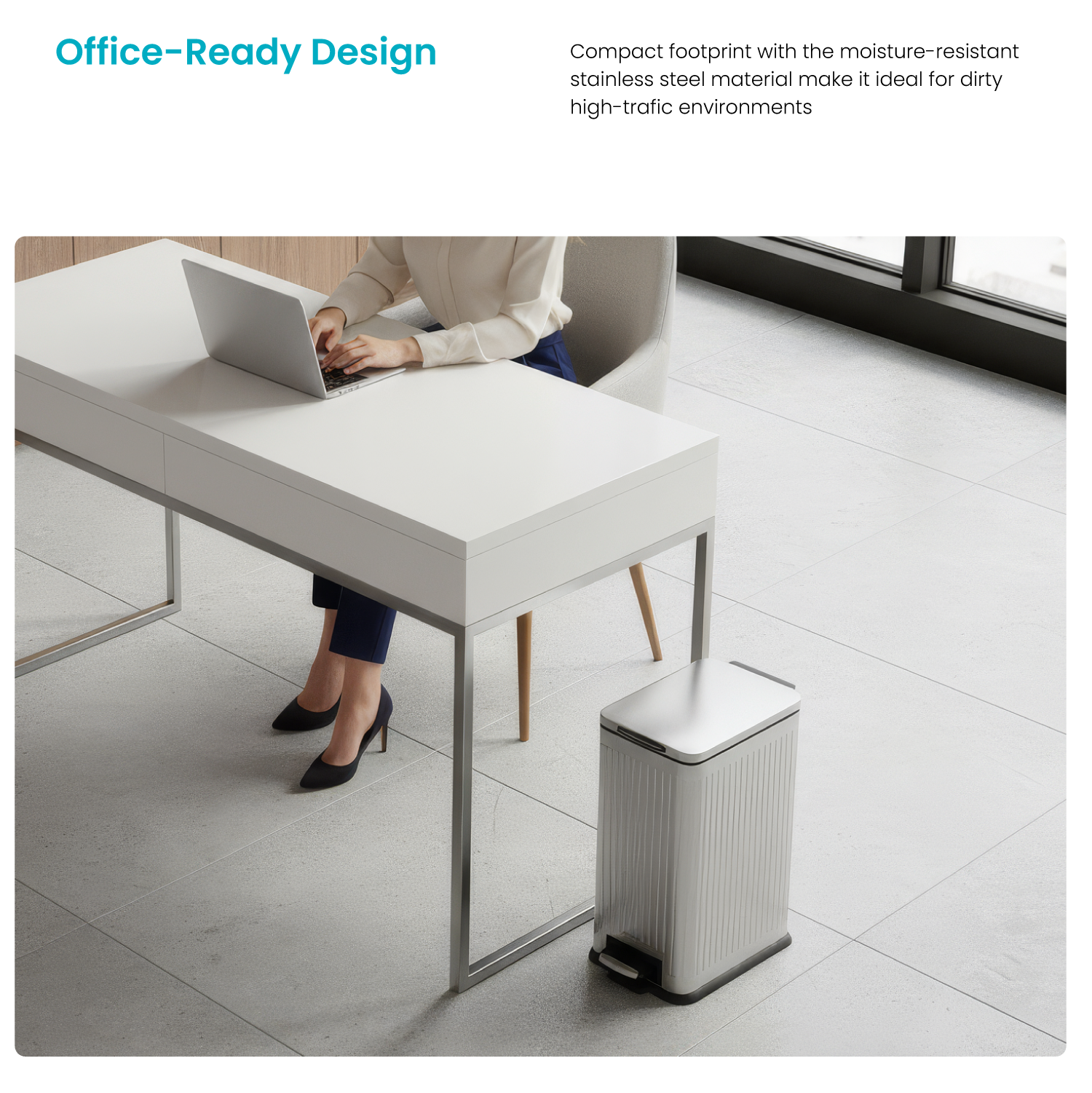 Slim Style for Everyday Spaces. Perfect for kitchens, bathrooms, and offices, this tall and narrow trash can fits neatly under counters, beside cabinets, or tucked into corners. A removable inner bucket with a built-in bag band makes swaps quick and mess-free, while the durable foot pedal offers hygienic, hands-free use when your hands are full. The soft-close lid shuts quietly to maintain a calm atmosphere, and the fingerprint-resistant stainless steel finish keeps the exterior looking clean and polished.
