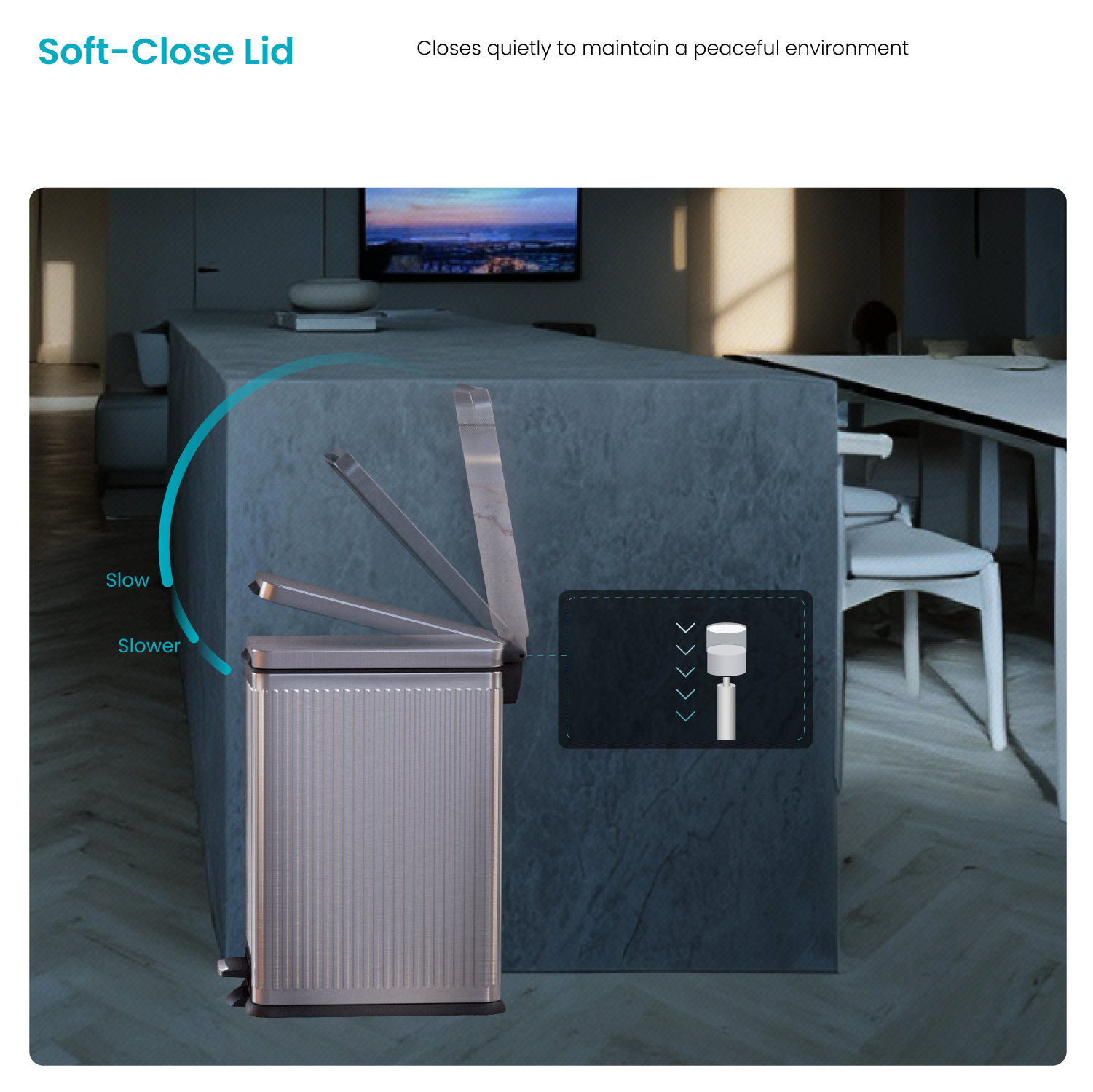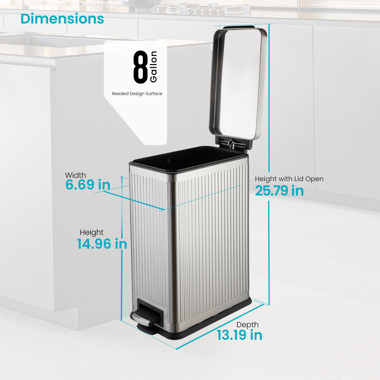 Slim Build, Everyday Capacity. This 8-gallon trash can is designed to make the most of narrow spaces while still providing practical capacity for daily household use. Perfect for kitchens, bathrooms, offices, or laundry rooms, the slim profile tucks neatly against walls or between cabinets. A removable inner liner with a built-in bag tuck band keeps bags secure and hidden, while the durable step pedal offers hygienic, hands-free convenience. The soft-close lid shuts gently to prevent noisy slams, and the fingerprint-resistant stainless steel finish with a ribbed design blends seamlessly into modern interiors.