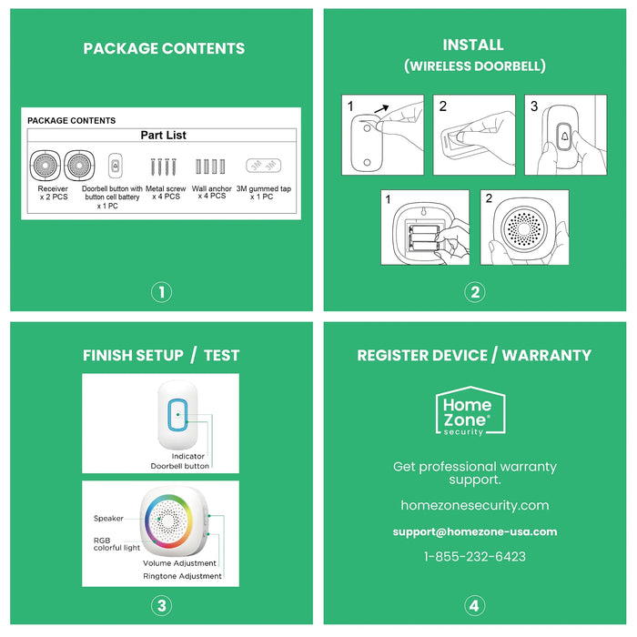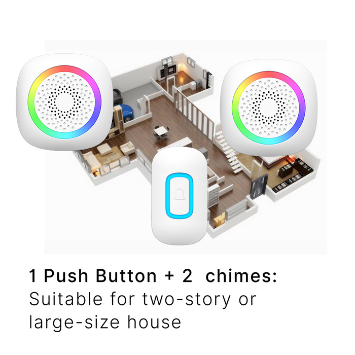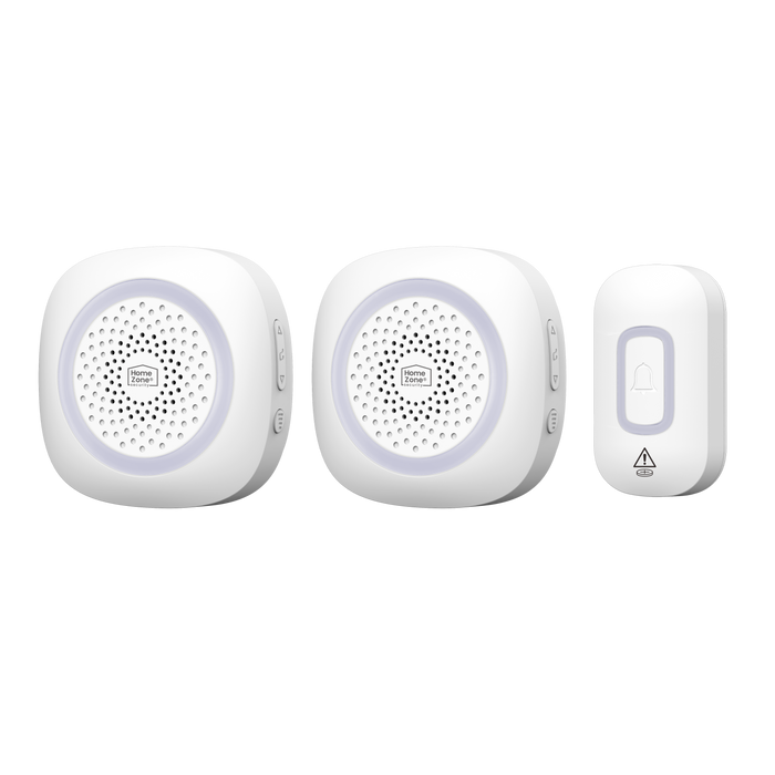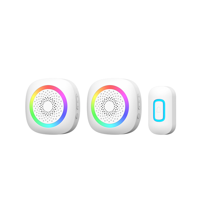 Add both a RGB visual and an audio signal to your doorbell system with the HomeZone Battery Operated Wireless Doorbell system (Model ES01065B). This set comes with one push button remote and two receivers. The receivers are capable of pairing with up to 20 remotes and can transmit up to 900 feet in open air connectivity. Choose from 5 volume selections and 60 ringtone selections. This system is perfect for people with varying degrees of auditory loss. Low battery indicators automatically show when the batteries are running low and should be replaced. CR2032 (button batteries) are included in the remote. AA batteries will need to be purchased for the receivers (3-batteries each). This doorbell system does not have a compatible smart control system.